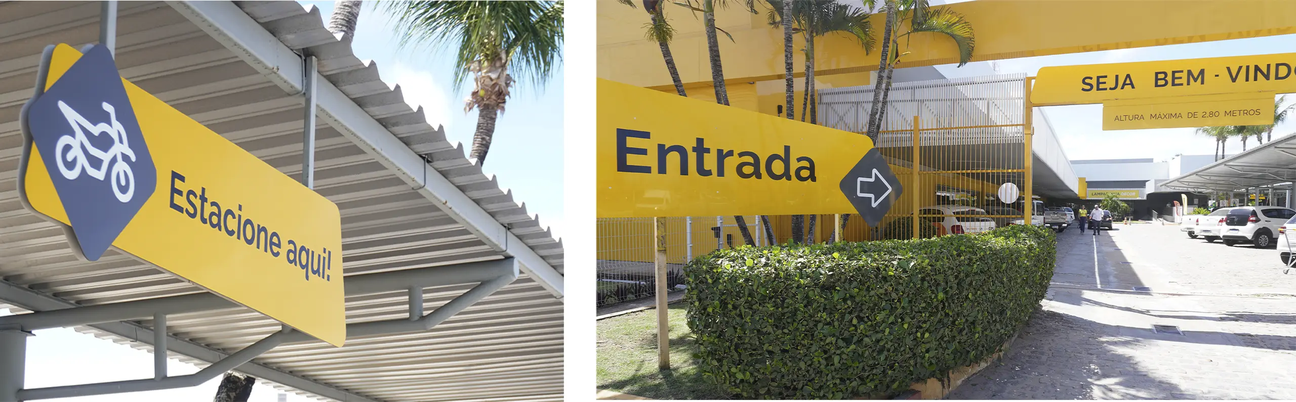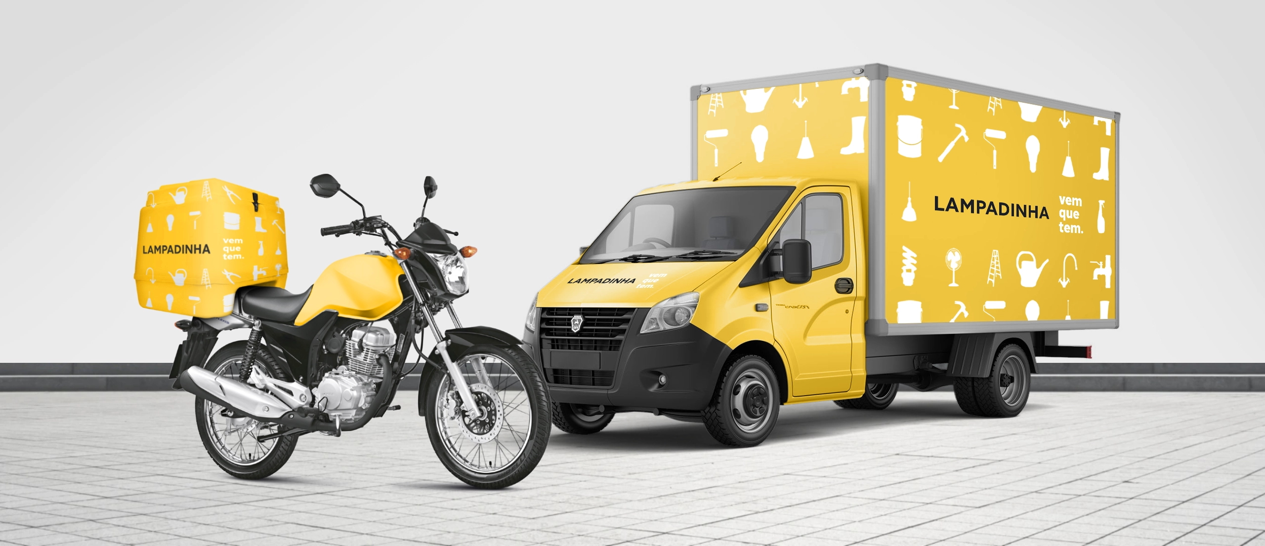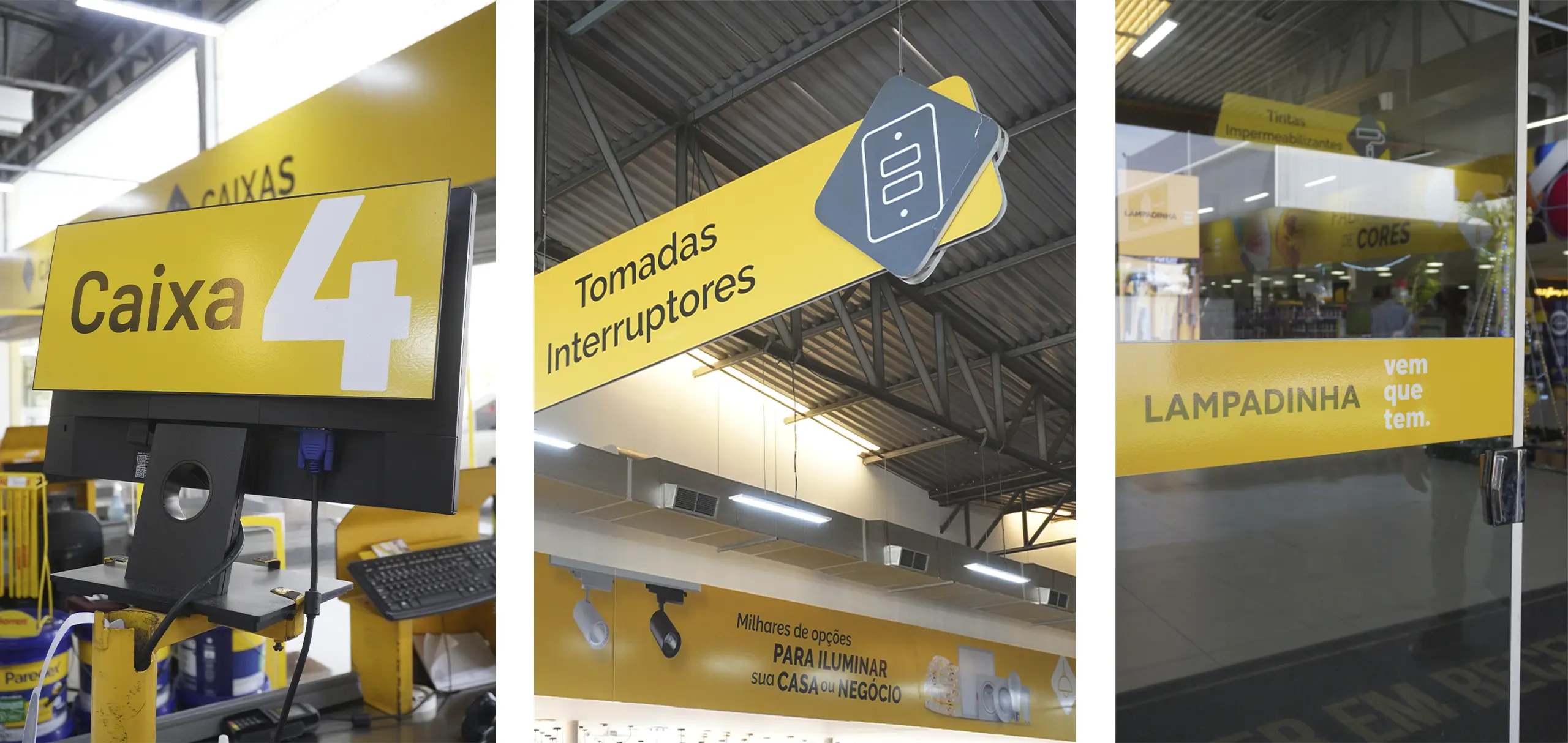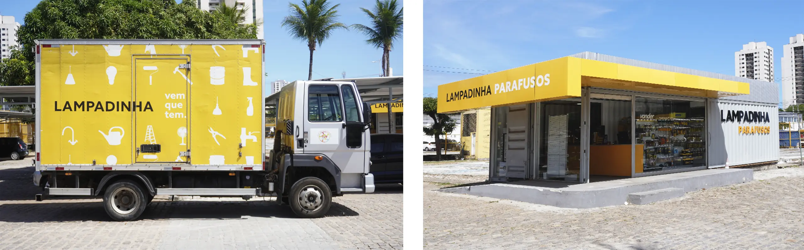 Desde placas apontando os setores dentro das lojas, totens – sempre pensando em facilitar a jornada de compra do consumidor – até fachadas e caminhões, tudo feito com uma identidade visual especialmente pensada para fortalecer a marca da Lampadinha e sua presença no dia a dia de seus clientes.